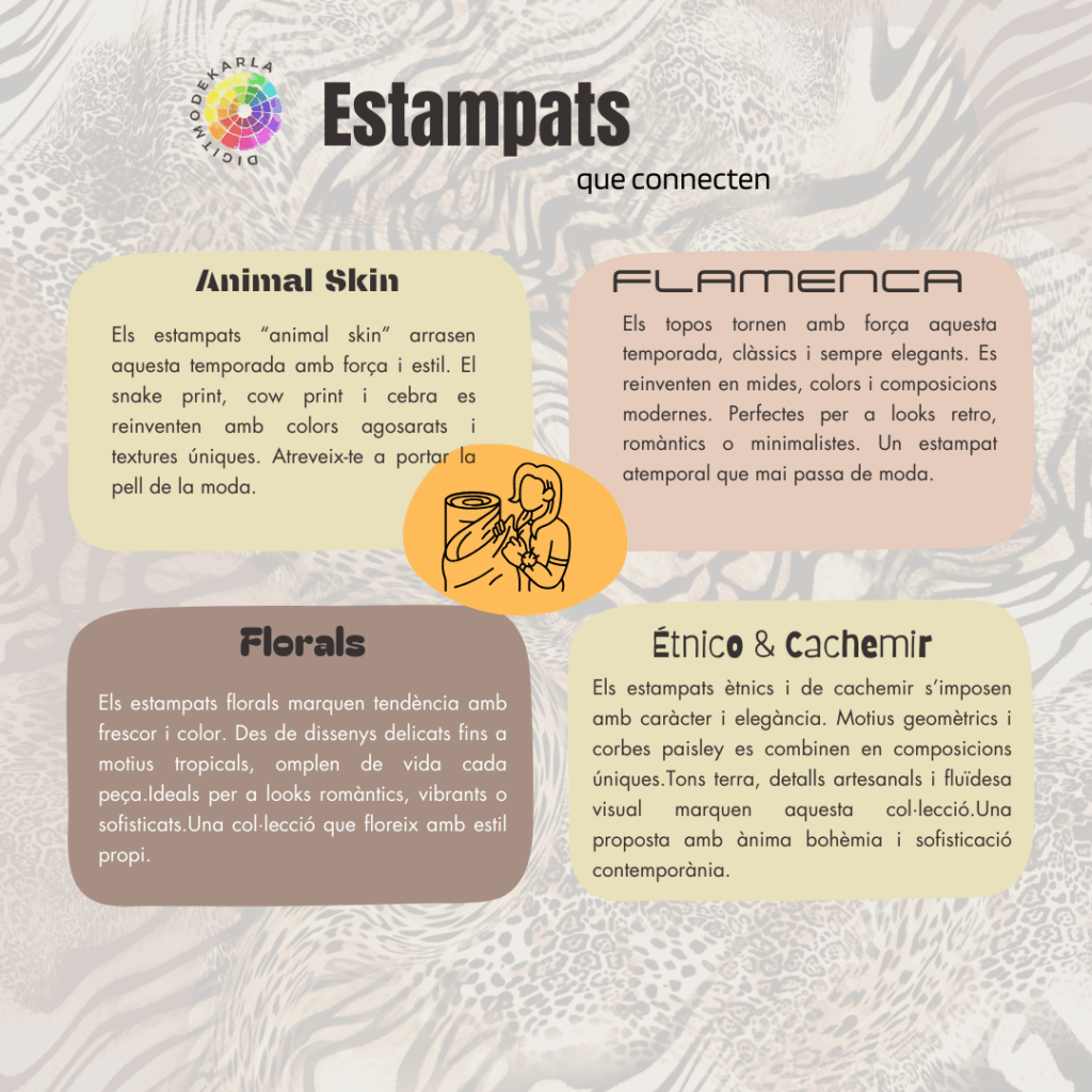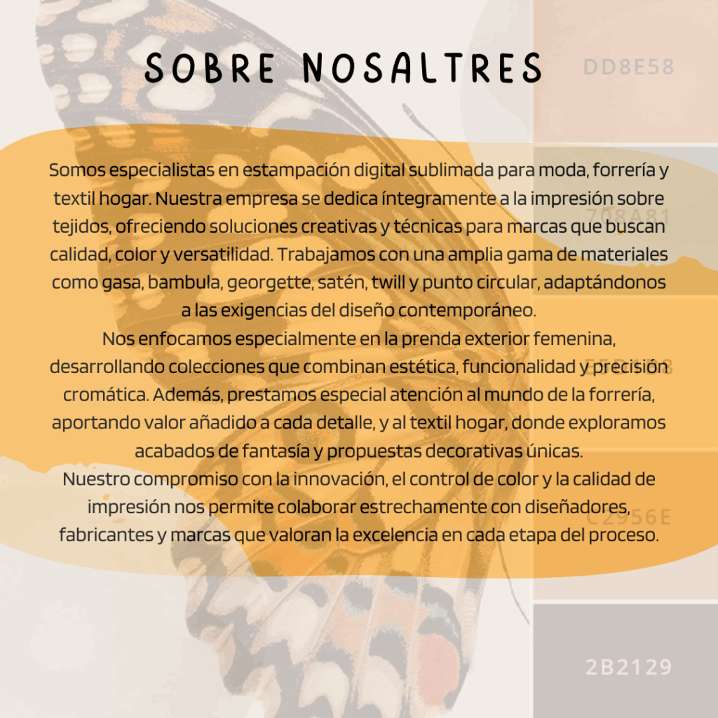 Som una empresa d'estampació per Sublimació Digital, i acabats amb mes de 20 anys d'experiencia.Estamos ubicats a Esparreguera (Barcelona) .Disposem del nostre propi departament de disseny de dibuixos, amb la finalitat de proposar cada temporada una col·lecció àmplia de dibuixos de moda dona.