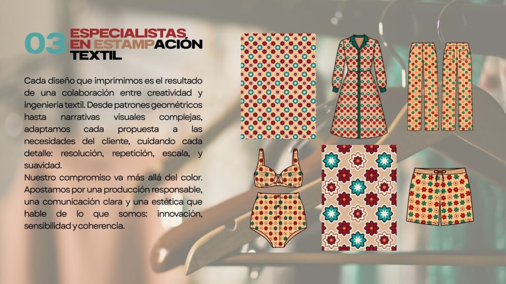 Somos una empresa de estampación por Sublimación Digital, y acabados con mas de 20 años de experiencia.Estamos ubicados en Esparraguera (Barcelona).Disponemos de nuestro propio departamento de diseño de dibujos, con la finalidad de proponer cada temporada una colección amplia de dibujos de moda mujer.